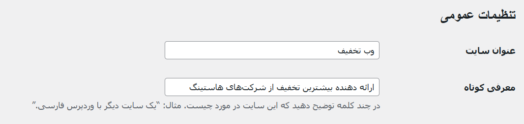 توضیحات کوتاه (Tagline / Blogdescription): یک خط توضیح کنار عنوان سایت. در بسیاری از قالبها نشان داده نمیشود، اما در متاتگها یا فوتر استفاده میشود. در دیتابیس، آپشن blogdescription است.